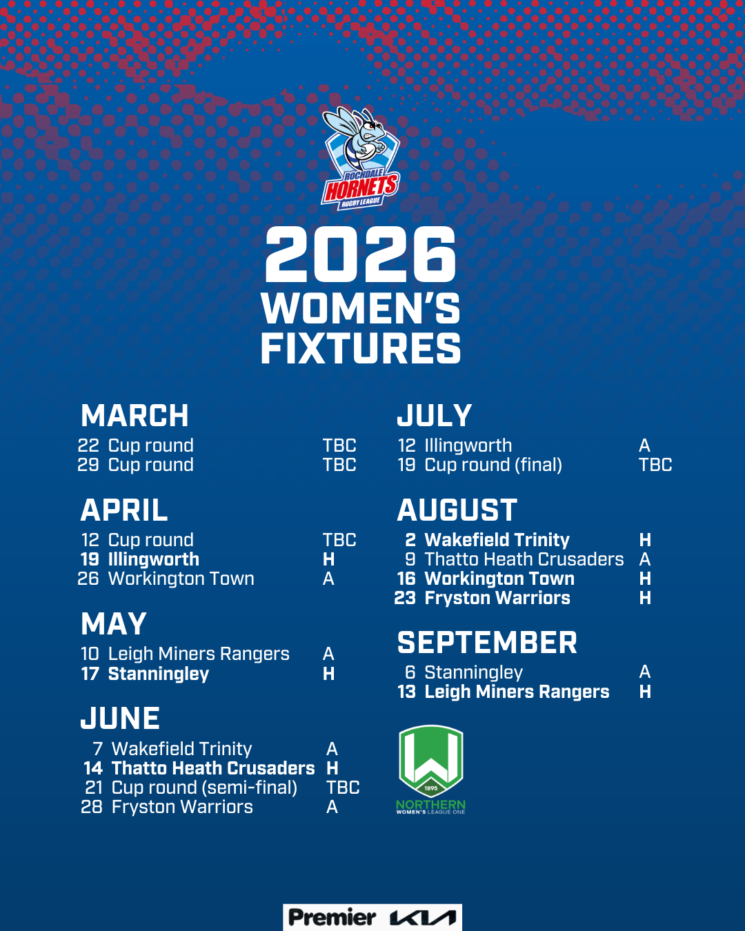 The Hornets Women will start their campaign at home to Illingworth on Sunday 19 April before back-to-back away games against Workington Town and Leigh Miners Rangers.